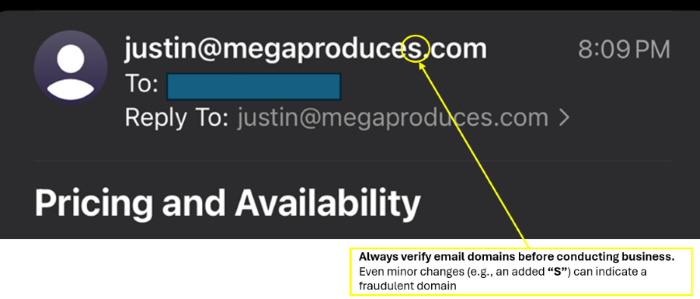 The primary indicator that this email is fraudulent is found in the domain. The legitimate address is justin@megaproduce.com, while the impersonator used justin@megaproduces.com—adding a single “S.” This subtle change is a common tactic and can be easily overlooked without careful review.