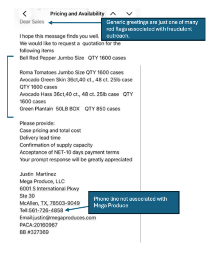 In addition to the fraudulent domain, the email contains a generic greeting—a commonly observed red flag—and lists a phone number not associated with Mega Produce, LLC.